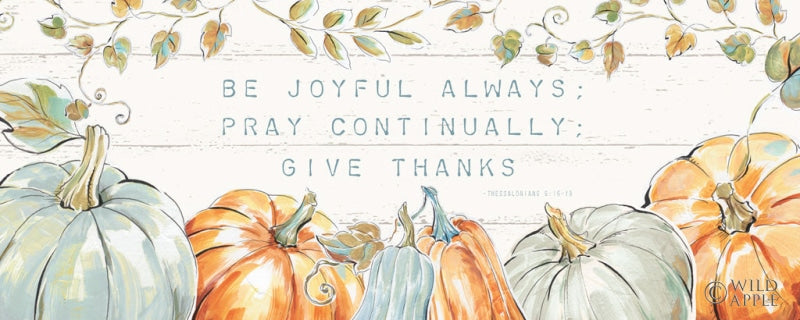 Elevate your home aesthetics with our inspirational pumpkin-themed art print, a serene addition to your wall decor collection. This charming illustration features a beautiful blend of autumnal oranges and soothing blues, depicting a variety of pumpkins nestled amidst delicate leaves and vines. Centered against a rustic white wood backdrop, the artwork is embellished with the uplifting message "BE JOYFUL ALWAYS; PRAY CONTINUALLY; GIVE THANKS," drawn from Thessalonians 5:16-18, rendered in elegant, flowing script. Perfect for creating a warm, inviting atmosphere, this art print serves as a daily reminder of gratitude and positivity. Crafted with meticulous attention to detail, our premium wall art print is designed to bring a touch of seasonal sophistication to any space, from the cozy corners of your living room to the welcoming walls of your dining area. Whether you're looking to inspire heartfelt conversations or just want to infuse your surroundings with a bit of fall harvest charm, this art piece is an ideal choice. Its versatile design complements a range of home decor styles, including rustic, farmhouse, traditional, and transitional interiors. Invite the spirit of thankfulness into your abode with this exquisite wall art print, a must-have for those who cherish the beauty of autumn and the sentiment of inspirational verses. It's not just a visual treat but also a meaningful gift for loved ones on special occasions like Thanksgiving, housewarmings, or just as a thoughtful gesture to spread joy and encouragement.For more art by Daphne Brissonnet click here.
