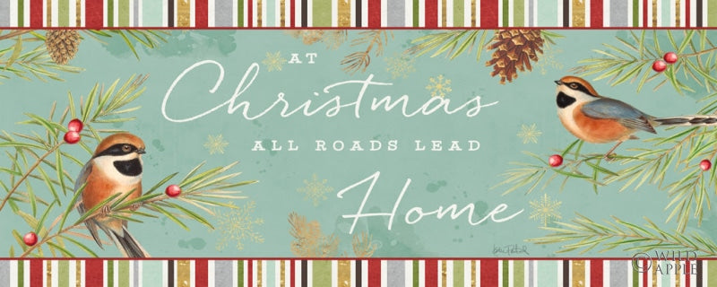 Immerse your space in the cozy ambiance of the holiday season with this charming Christmas-themed wall art print. This festive piece features the heartwarming phrase "At Christmas All Roads Lead Home," artistically inscribed in a graceful, flowing script. The background is a tranquil teal, evoking a sense of winter's calm, and is graced with vibrant illustrations of two sweet birds, a classic symbol of nature's beauty. The birds are perched among sprigs of evergreen pine and holly berries, interwoven with delicate snowflakes and pine cones that conjure images of a serene winter landscape. Adorned with a border that combines rustic stripes in shades of red, green, and gold, this print captures the traditional colors of the holiday season. The design's vintage charm is perfect for creating a nostalgic yuletide atmosphere in any room of your home. This wall decor item is a beautiful expression of the joy and warmth that fills our homes during this special time of year, making it an ideal addition to your own holiday decorations or a thoughtful gift for loved ones. Crafted with high-quality materials and attention to detail, our art print ensures longevity and durability, so you can enjoy the spirit of Christmas for many seasons to come. Whether it's displayed in your living room, dining area, or greeting guests in the entryway, this unique piece is sure to become a treasured part of your holiday tradition. Bring home this enchanting piece of wall decor and let theFor more art by Katie Pertiet click here.