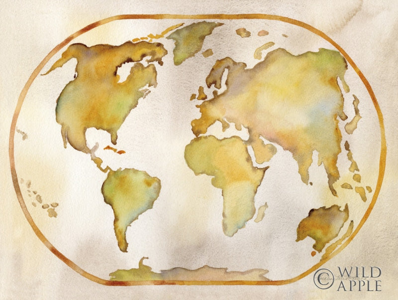 Embrace the wanderlust spirit with this exquisite world map art print, a perfect addition to your wall decor collection. This captivating piece features a delicately rendered map of the world, illustrated in a soft watercolor palette that brings a warm and sophisticated ambiance to any space. Elegantly depicted in hues of gold, rust, and earth tones, this high-quality art print captures the beauty of our planet with an artistic twist that complements a variety of interior styles, from contemporary to traditional. Whether it's for your living room, home office, or as a thoughtful and educational piece in a child's bedroom, this world map is an inviting conversation starter. Ideal for geography enthusiasts, travelers, and art lovers alike, it's an exquisite selection for anyone seeking to enhance their home with a touch of elegance and world charm. Add this timeless wall decor element to your collection and let it serve as a daily inspiration to explore and cherish the world around us.For more art by Kathleen Parr McKenna click here.