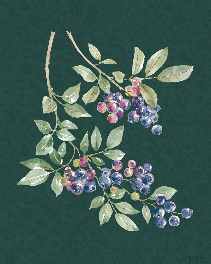 Elevate your home decor with this exquisite Watercolor Blueberry Branch Art Print. A visually refreshing piece, this artwork showcases a beautiful array of blueberries on the branch, delicately painted in a watercolor style that brings a natural and serene vibe to any room. Set against a dark green, patterned background, the vibrant blues and subtle pinks of the blueberries create a captivating contrast that adds an organic and elegant touch to your wall decor collection. This high-quality art print is perfect for those looking to incorporate botanical wall art or a touch of nature-inspired elegance into their living space, dining room, or kitchen. The subtle hues and detailed brushwork make it a versatile piece, aligning well with minimalist, rustic, or traditional interior styles. Whether you're an art aficionado, a lover of farmhouse chic, or seeking to create a tranquil space with artistic flair, this Watercolor Blueberry Branch Art Print is an ideal choice to enhance your home ambiance with sophistication and a splash of color.For more art by Beth Grove click here.