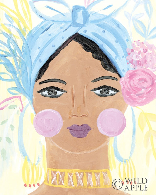Immerse your living space in a vibrant blend of culture and beauty with this exquisite contemporary art print. Depicting a striking portrait, this piece captures the essence of abstract and modern aesthetics, ideal for anyone seeking to enhance their home decor with a touch of sophistication and a splash of color. The image features a serene female subject adorned with a whimsical blue headwrap, set against a backdrop of soft pastel yellow hues that exude warmth and serenity. Vibrant pink and lavender floral elements elevate the visual interest and give this art print a delightful botanical flair, making it a perfect addition to your gallery wall. With eyes that seem to follow you around the room, the portrait embodies a sense of timelessness and emotion, drawing you into the world of artful expression. Crafted with the finest attention to detail, this high-quality art print is a staple for those who appreciate unique wall art and are looking to create an inspired and inviting atmosphere in their home or office. Whether styled as bedroom wall art, a statement piece in your living room, or a conversation starter in your entryway, this elegant print is certain to captivate and charm all who lay eyes upon it. Add this enchanting piece to your collection today and bring a piece of contemporary chic right into your living environment.For more art by Farida Zaman click here.