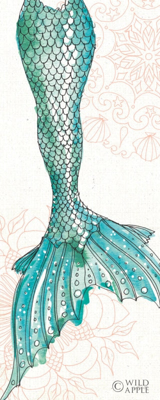 Elevate the ambiance of any room with this enchanting mermaid tail art print, a perfect addition for those seeking a touch of whimsy and fantasy in their home decor. Expertly crafted, this print showcases a beautifully detailed mermaid tail, adorned with scales in tranquil shades of teal and green, which cascades into an elegant fluke with dotted accents, adding a sense of depth and texture to the piece. Set against an off-white background with subtle floral and mandala-inspired patterns, this art print exudes a serene and calming vibe, ideal for creating a peaceful retreat in your bedroom, bathroom, or any space that calls for a splash of ocean-inspired charm. Designed with the ocean lover in mind, it makes for an exquisite wall decor element, offering a mythical and nautical touch to your interior design. Collectors of mermaid-themed items, fans of marine life illustrations, and anyone with an appreciation for intricate and captivating wall art will find this art print an irresistible addition to their collection. Don't miss the opportunity to transform your living area, study nook, or reading corner with this mesmerizing and unique piece that's sure to captivate the imagination and accentuate your coastal or fantasy-themed decor.For more art by Anne Tavoletti click here.