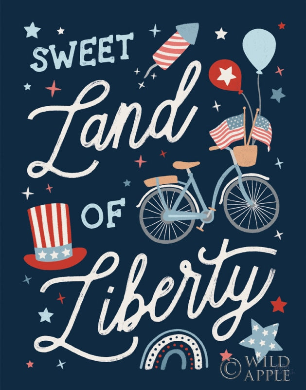 Celebrate your love for freedom and the charms of Americana with our delightful "Sweet Land of Liberty" art print – a charming addition to any wall decor collection! This whimsical piece features a classic navy background sprinkled with stars in red, white, and blue, capturing the spirit of patriotic pride. The central script is cheerfully written, reminding one of vintage hand-painted signs, and is flanked by an array of charming illustrations - a retro bicycle proudly bearing the American flag in its basket, a top hat adorned with stars and stripes, and colorful balloons and fireworks reminiscent of a Fourth of July celebration. Crafted with warmth and nostalgia, this patriotic wall art print is perfect for those who love a touch of traditional Americana in their home decor. Whether you're looking to brighten up your entryway, add a focal point to your living room, or gift a piece of heartwarming art to a friend, this print is versatile for various occasions. It’s a splendid choice for enhancing your decor with a piece that embodies the spirit of American heritage and joy. Suitable as a Fourth of July decoration or as a year-round testament to liberty and joy, this art print is a must-have for anyone wanting to infuse their space with a sense of patriotic flair. Printed on high-quality materials, ensuring longevity and vibrant colors, our "Sweet Land of Liberty" art print is designed to be a treasured part of your wall art collection for years to come. Bring home this sliceFor more art by Laura Marshall click here.