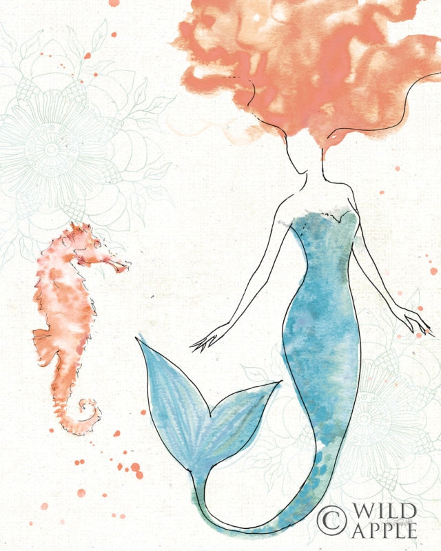 Dive into a serene and whimsical aquatic world with our enchanting mermaid and seahorse art print, a must-have addition to your wall decor collection. This delightful art piece showcases a graceful mermaid with a flowing, coral-hued hair, expressing a dreamy underwater elegance. Accompanying her is a charming seahorse, adding a touch of maritime magic to the scene. Crafted with an eye for ethereal beauty, the mermaid's tail is painted in tranquil shades of ocean blue, merging seamlessly with the calming cream background. Elegant sketches of floral mandalas faintly embellish the backdrop, enhancing the print's intricate allure. Perfect for bringing a splash of ocean-inspired charm to your living room, bedroom, or bathroom, this art print is a versatile gem. The exquisite detail and soft watercolor palette make it ideal for anyone looking to update their space with contemporary nautical decor or wishing to create a serene seaside ambiance. Whether you're a mermaid enthusiast or simply appreciate the beauty of marine-inspired artwork, this art print will become a captivating focal point in your home, inviting viewers to pause and lose themselves in its tranquil depths. Add this piece to your cart today and let your wall tell a tale of ocean dreams and underwater serenity.For more art by Anne Tavoletti click here.