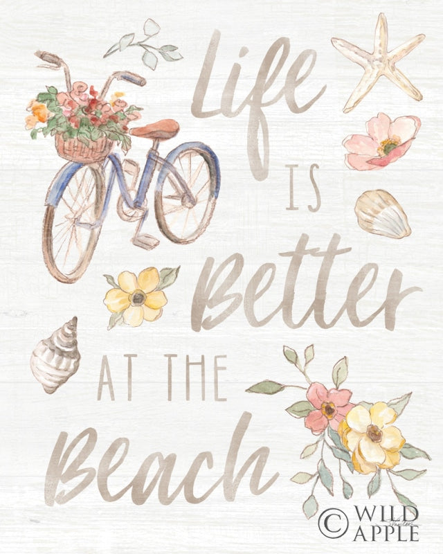 Bring a touch of coastal serenity to your living space with our charming "Life is Better at the Beach" art print. This delightful piece of wall decor features a quaint illustration of a vintage bicycle, complete with a basket overflowing with fresh, colorful flowers. Surrounding the bike are serene elements of beach life: a sprightly starfish, a collection of gentle seashells, and blooming florals that exude a sense of peacefulness and the joys of seaside living. Crafted with a soft, neutral palette and a rustic wood plank background, this print effortlessly conveys the warmth and relaxed vibe of a day at the beach. The graceful hand-lettering adds a personal, whimsical touch that reminds one to cherish the simple pleasures of life by the shore. Perfect for anyone looking to create a cozy coastal retreat in their home or just to infuse their environment with a bit of beach-inspired tranquility, this print is an excellent choice for your bedroom, bathroom, living room, or even a beach house. The soothing colors blend harmoniously with a variety of decor styles, making it a versatile addition to your collection of coastal wall art. Hang it up, sit back, and let this lovely art print remind you that no matter the hustle and bustle of daily life, a part of your heart can always be seaside, savoring the belief that indeed, life is truly better at the beach.For more art by Silvia Vassileva click here.