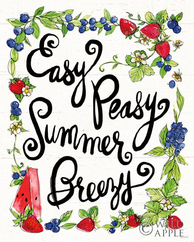 Bring a touch of summer's warmth and lightheartedness into your home with our charming "Easy Peasy Summer Breezy" art print. This delightful wall decor features whimsical hand-lettered text surrounded by a vibrant wreath of summer berries and greenery, including lush blueberries and ripe strawberries, accented by a juicy watermelon slice. Each art print exudes a refreshingly casual vibe, perfect for setting a carefree and inviting atmosphere in your kitchen, dining area, or any space that could use a burst of cheer. Crafted with love and artistic flair, this berry-inspired artwork is not only a celebration of the sunny season but also a versatile piece of home decor that complements a variety of interior design styles from country chic to modern farmhouse. Add this lovely print to your collection and enjoy the essence of summer all year round!For more art by Anne Tavoletti click here.