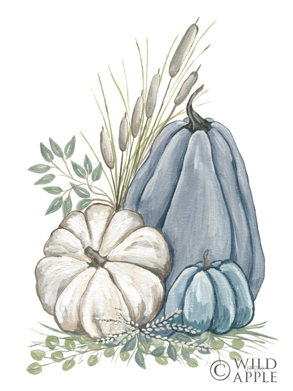 Bring the serene charm and the splendor of the harvest season into your home with our exquisite Autumn Elegance Pumpkin and Gourd Art Print. Perfect for adding a touch of tranquility and natural beauty to your living space, this wall decor features a delightful trio of pumpkins and gourds painted in soft, muted tones that exude an air of calm and sophistication. The central focus of this print is a trio of pumpkins, rendered in gentle shades of blue and white, which together create a soothing palette ideal for a variety of interior design themes. Amidst these autumnal treasures, delicate sprigs of wheat and dainty green foliage add a touch of whimsy and life, making it a versatile piece that can complement both contemporary and traditional styles. Crafted with attention to detail, this art print showcases fine brushwork and a keen eye for light and shadow, giving the still life a three-dimensional feel that's so lifelike, you can almost feel the cool autumn breeze. It's a must-have piece for anyone looking to infuse their space with the elegant simplicity of nature's bounty. Whether you're decking out a cozy country kitchen, creating a peaceful reading nook, or designing a welcoming entryway that makes an impression, our Autumn Elegance Pumpkin and Gourd Art Print will be the perfect addition. Its timeless appeal makes it an ideal gift for a housewarming, a thoughtful present for Thanksgiving, or simply a new treasure for your own collection of wall decor.For more art by Yvette St. Amant click here.