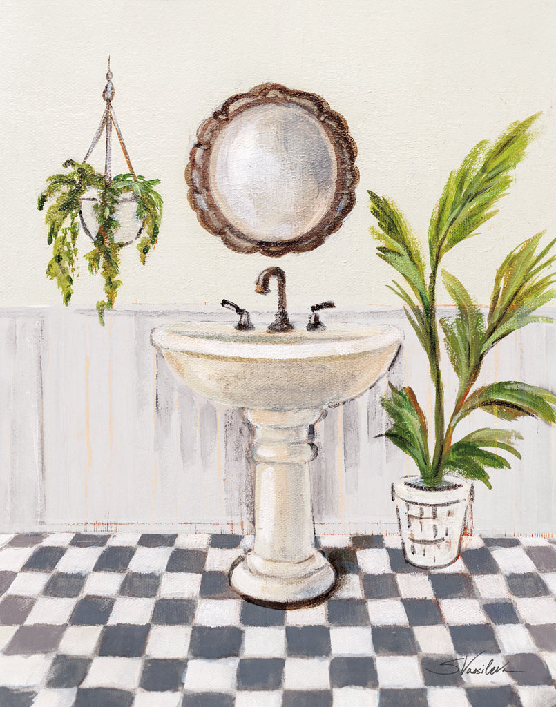 Elevate your home decor with our exquisite Vintage Bathroom Sink Art Print, a charming addition to any wall in need of an artistic touch. This delightful piece captures the timeless elegance of a classic bathroom scene rendered in soothing neutral tones. The beautifully detailed artwork features a pedestal sink, complete with antique-style fixtures, set against a backdrop of a subtle checkered floor and wainscoted wall. Enhancing the serene ambiance, a hanging potted plant adds a touch of greenery, while a companion plant in a decorative pot stands guard at the side. Perfect for those looking to infuse a sense of calm and sophistication into their bathroom, powder room, or any space that could use a quaint visual escape, this art print speaks to lovers of both vintage aesthetics and interior design. Whether you're creating a gallery wall or searching for that stand-alone statement piece, this wall decor exudes a welcoming vibe that guests and family alike will adore. Crafted with care, our high-quality art print is designed to fit seamlessly into a variety of frames and matting options to suit your personal style. It's an ideal housewarming gift, a thoughtful present for vintage enthusiasts, or a special treat for yourself. Add a dash of refined tranquility to your home with this must-have Vintage Bathroom Sink Art Print and watch as it becomes a conversation piece for years to come.For more art by Silvia Vassileva click here.