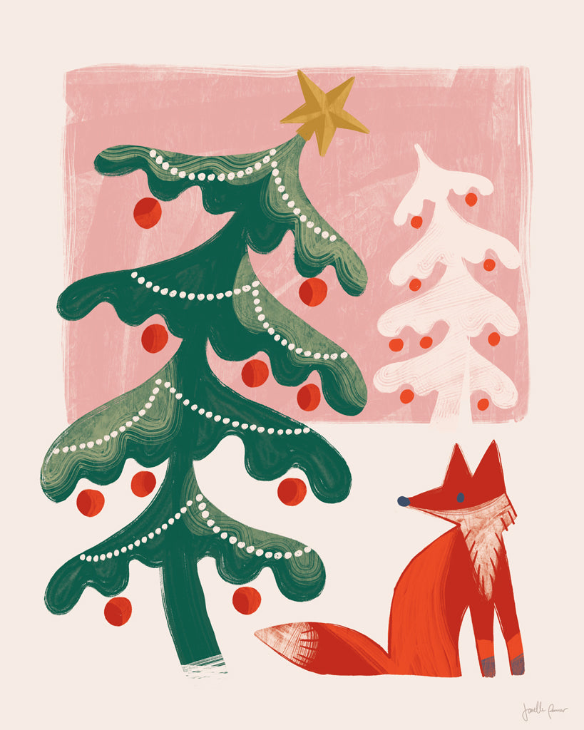 Add a touch of whimsical charm to your living space with this enchanting art print, perfect for those looking to infuse their wall decor with a dash of woodland magic. This delightful illustration features a stylized, ruby-red fox sitting peacefully beside a captivating Christmas tree, adorned with festive garlands and a striking golden star atop its boughs. A backdrop of soft, blush pink sets the stage for this heartwarming scene, evoking a sense of holiday warmth and cheer. Ideal for creating a cozy corner in your home or adding to a gallery wall collection, this illustrated print brings the beauty of nature indoors with a playful twist. The artful combination of rich, earthy tones and playful festive elements makes this piece a unique gift for art lovers or a splendid addition to your seasonal decor. Whether you're decking the halls or simply infusing your interior design with a little extra joy, this high-quality art print is sure to capture hearts and complement an array of home decor styles from modern to traditional. Don't let your walls go bare this season; invite the magic of this enchanting forest scene into your home for a touch of holiday wonder that lasts all year round.For more art by Janelle Penner click here.