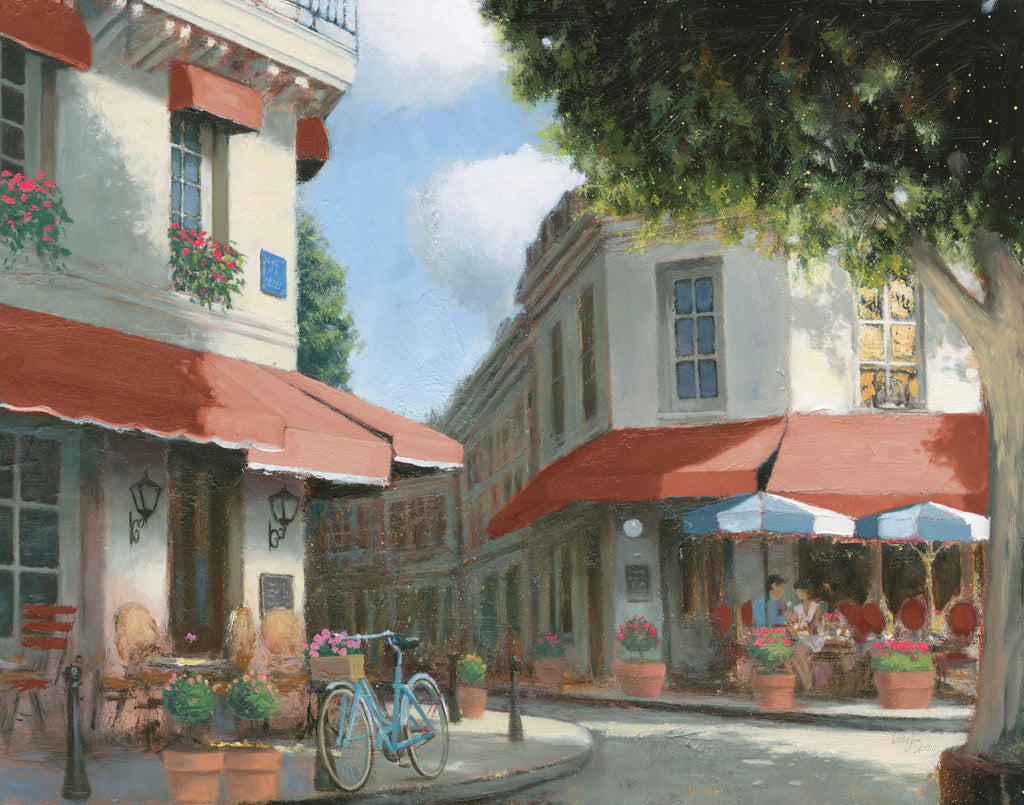 "Breakfast in Paris Dark" by Wellington Studio captures the quintessential charm and ambiance of a leisurely Parisian morning. This captivating art piece elegantly melds elements of impressionism and modern realism to evoke a timeless scene set against an idyllic Paris street. The composition seduces the viewer with its meticulously rendered details – from the vibrant blossoms cascading over terrace balconies to the gentle interplay of sunlight and shadow dancing on the café's awning. The scene is set in a quaint corner of Paris, possibly within a historic arrondissement, where a boutique café invites passersby to indulge in the simple pleasure of a morning meal. The outdoor seating, characterized by classic woven bistro chairs, sets a welcoming atmosphere, suggestive of shared moments over coffee and croissants. A striking contrast is achieved through the juxtaposition of verdant greenery and the bright, inviting reds of the awnings, conjuring a refreshing visual balance. One striking element is the inclusion of a bicycle casually resting against an outdoor table, laden with a basket of fresh flowers, emblematic of a leisurely Parisian lifestyle. The two patrons seated beneath striped umbrellas engage in animated conversation, infusing life into the artwork while remaining harmonious with the serene backdrop of sun-dappled trees and historic architecture. The use of rich, yet subdued color palettes and the soft diffusion of light reflect the mastery in creating a mood that is both inviting and contemplative. The delicate brushstrokes, attention to texture, and atmospheric perspective are reminiscent of impressionist influences, yet the precision in depicting architectural elements speaks to a modern realist approach. "Breakfast in Paris Dark" is an artistic representation that captures not merely a scene but a sentiment, transporting the viewer to a timeless, peaceful moment in the enchanting city of Paris. It is an encomium to the elegance of everyday life, perfectly suited for lovers of art and those enamored by the romanticism of Parisian culture.For more art by Wellington Studio click here.