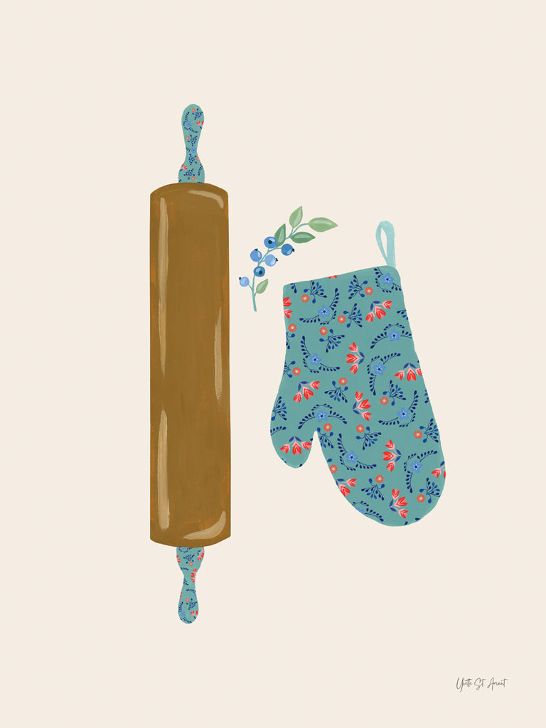 "Baking with Blueberries VI" by Yvette St. Amant is an intriguing piece that masterfully blends the simplicity and charm of domestic life with a vibrant, modern aesthetic. This artwork is a delightful representation of contemporary still life, showcasing a rolling pin and oven mitt, both intricately adorned with playful patterns. The rolling pin, a symbol of culinary artistry, contrasts beautifully with the delicately rendered sprig of blueberries and accompanying leaves. The composition's subtle balance allows these elements to coexist harmoniously on the canvas, inviting viewers into a tranquil culinary vignette. The piece’s soft neutral background acts as a gentle canvas, accentuating the warm wooden tones of the rolling pin and the cool, floral motifs adorning the oven mitt. The meticulous attention to detail is evident in the artist's use of color and form, creating a sense of depth and texture. St. Amant's work can be classified within the realm of contemporary folk art, infusing traditional kitchen motifs with a fresh and vivacious energy. This artwork exudes an inviting charm, making it a captivating addition to any space, perfect for those who cherish the intersection of art, home, and the joys of baking.For more art by Yvette St. Amant click here.