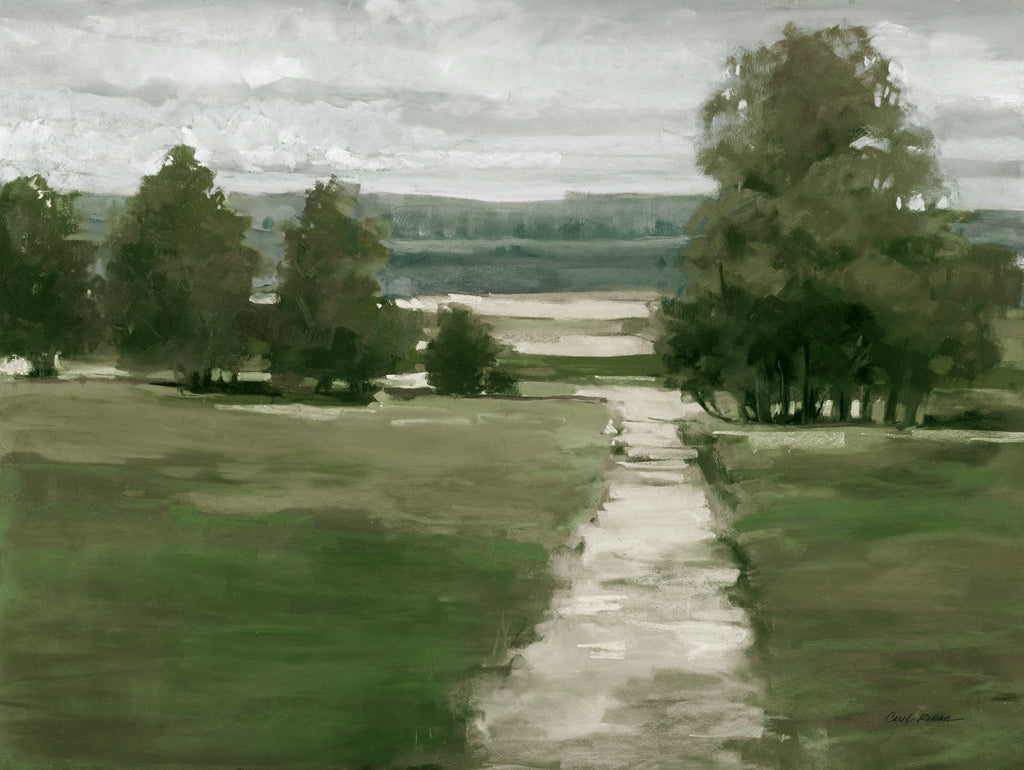 "Summer Path" by Carol Rowan is an evocative landscape painting that beautifully captures the tranquil essence of a leisurely walk through nature. The artwork portrays a wide, inviting path that leads the viewer's eye into the distance, flanked by lush greenery and mature trees that suggest a serene, pastoral setting. Rendered in a palette of soft greens and earth tones, the piece conveys a sense of warmth and peace, embodying the idyllic simplicity often associated with summer landscapes. The trees are painted with a delicate touch, their foliage rendered in varying shades of green, creating a harmonious rhythm that echoes the gentle undulations of the landscape itself. The sky above the path is a muted grey, hinting at an overcast day, which contrasts subtly with the verdant ground below, lending a sense of depth and atmosphere to the scene. This treatment of light and color showcases Rowan's skillful use of impressionistic techniques, evoking the transient beauty of a moment captured in time. "Summer Path" can be classified under Impressionism due to its emphasis on atmospheric effect and the emotive representation of nature. This art piece invites viewers to lose themselves in its tranquil beauty and offers a respite from the chaos of everyday life, making it a perfect addition to any space desiring a touch of serenity and natural beauty.For more art by Carol Rowan click here.
