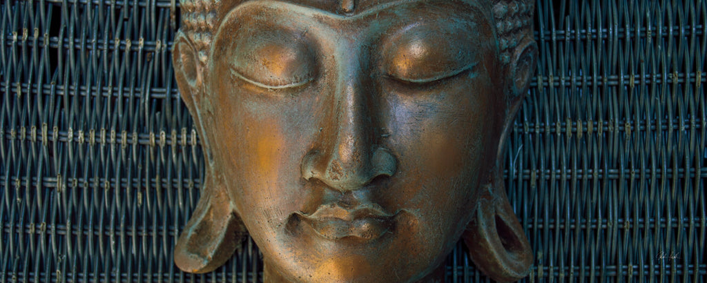 "Bronze Buddha Close Up" by Deborah Revell is a captivating representation that draws the viewer into the serene and contemplative essence of Buddhist art. The piece can be classified within the tradition of Buddhist iconography, capturing the tranquil expression and spiritual embodiment of the Buddha's visage. This artwork focuses on the face of the Buddha, rendered with a patina that reflects the lustrous and timeless quality of bronze. The eyes are gently closed, suggesting a state of deep meditation and inner peace, while the subtle smile speaks to the enlightenment and compassion associated with the Buddha. The detailed texture of the hair and elongated earlobes, hallmarks of traditional Buddhist sculpture, are meticulously depicted, adding an authentic touch to Revell's interpretation. The background features a woven texture, which complements the smoothness of the bronze, creating an interplay between the natural elements and the spiritual. Revell's piece serves as a modern homage to classical representations, embodying an aura of serenity and reverence. It invites observers to reflect on the spiritual journey towards enlightenment, making it an evocative addition to any space that values art with historical and cultural depth.For more art by Deborah Revell click here.