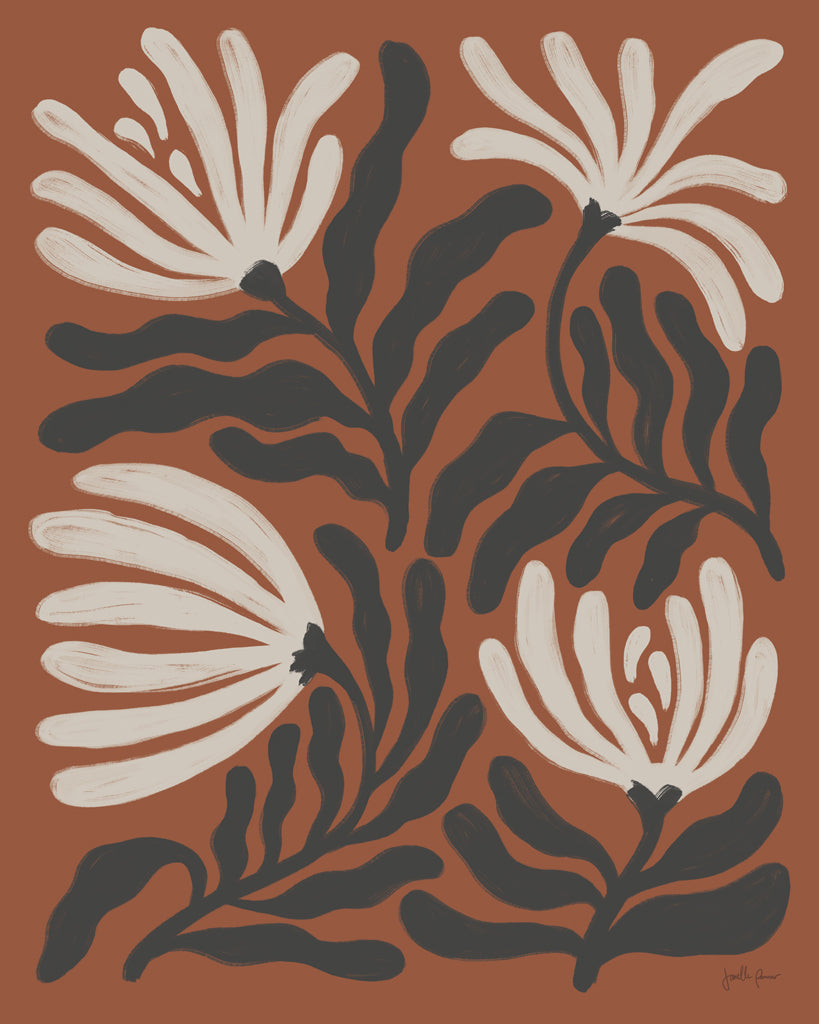 "Simple Petals I v2" by Janelle Penner is an exquisite exploration of form and contrast, seamlessly blending modern minimalism with organic motifs. The artwork is classified as contemporary floral abstraction, marked by its bold use of color and shape. Set against a warm terracotta background, the piece features an arrangement of stylized floral elements, primarily in monochromatic black and cream. The petals are elegantly elongated, suggesting movement and vitality, while their stark contrast against the rich earth-toned background creates a dramatic visual effect. The floral forms are both abstract and representative, inviting viewers to interpret the beauty of nature through a modern lens. Flowing leaves intertwine with the petals, adding depth and complexity to the composition. This art piece embodies a harmonious balance between simplicity and sophistication, making it a versatile addition to any space, evoking a sense of tranquility and contemporary elegance.For more art by Janelle Penner click here.