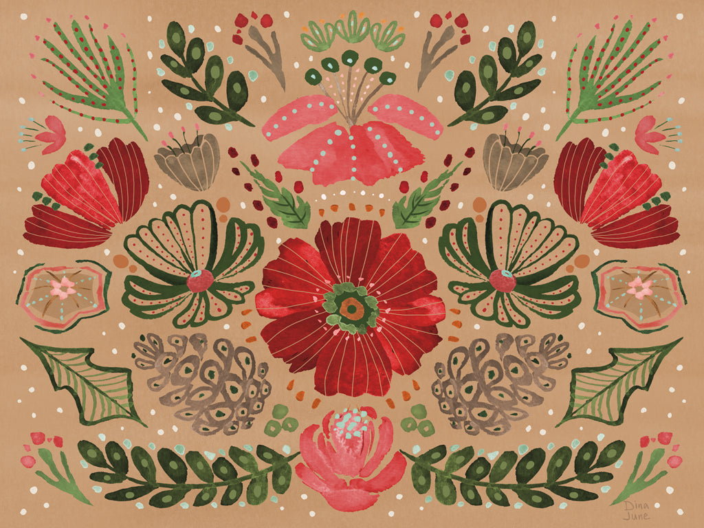 "Holiday Lore III," an enchanting piece by Dina June, is a harmonious celebration of festive botanicals rendered in a folk art style. The composition is a vibrant tapestry of nature-inspired motifs, set against a warm, earthy background. Central to the artwork is an elaborate arrangement of stylized flowers, where crimson reds, verdant greens, and soft pinks interlace in symmetrical elegance. The focal point is a bold red flower, whose petals radiate outwards, creating a sense of depth and movement. Surrounding it, pairs of detailed leaves and blossoms extend in mirrored symmetry, each element meticulously crafted to echo the natural ebb and flow of garden flora. Dotted accents of white and subtle beige provide a rhythmic punctuation throughout the design, adding a festive, almost snow-kissed charm. Interspersed among the florals are suggestive hints of holiday motifs—holly leaves and berry clusters—that evoke a nostalgic wintry ambiance. The artwork captures a folkloric aesthetic, resonating with traditional patterns while simultaneously offering a contemporary appeal. This piece can be classified as modern folk art, distinguished by its ornamental beauty and the rich storytelling emblematic of seasonal celebrations.For more art by Dina June click here.
