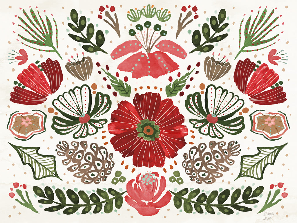 "Holiday Lore III Light" by Dina June is a captivating work that embodies the essence of festive botanical themes through its harmonious composition and vibrant palette. This piece, classified within the realm of contemporary folk art, reflects the joyous and nostalgic spirit of the holiday season. The artwork showcases an array of stylized flora, featuring prominent motifs of poinsettias, pine cones, and various leafy elements. These are skillfully rendered in warm, rich hues of red, green, and brown, interspersed with delicate pinks and earthy neutrals. The symmetrical arrangement suggests a balance and order, reminiscent of classical floral patterns, yet is imbued with a modern touch that enhances its charm and accessibility. The use of watercolor techniques provides a gentle fluidity to the forms, creating an inviting texture that adds depth and character. The white background serves to illuminate the colors, giving the piece a fresh, airy quality while evoking the crispness of winter. Dina June's expert blending of traditional holiday symbols with contemporary stylization results in a work that is both timeless and inviting, ensuring its place as a cherished addition to any festive art collection.For more art by Dina June click here.