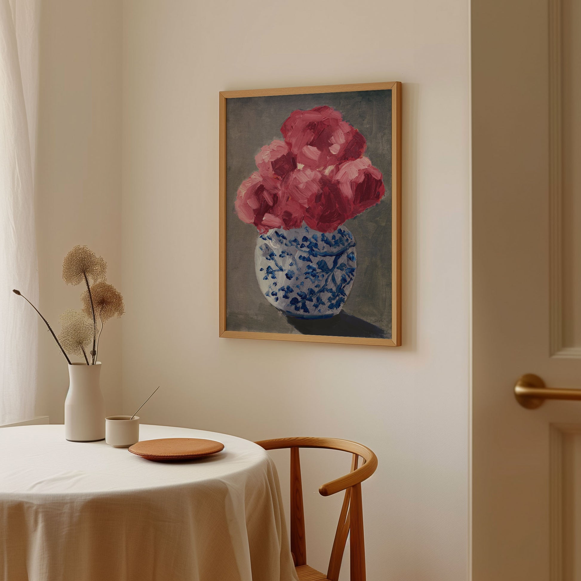 "Peonies in Chinoiserie Vase Country Traditions" by Carson Overstreet exemplifies a harmonious blend of traditional still life and modern impressionistic techniques. This piece features a vibrant bouquet of peonies rendered in bold, gestural brushstrokes, exhibiting shades of pink and red that create a captivating interplay of light and shadow. The choice of a Chinoiserie vase lends an additional layer of artistic complexity and cultural reference, with intricate blue floral patterns against a subdued gray background, serving as a counterpoint to the vivid blooms. Overstreet's work can be classified under contemporary realism with an impressionistic flair, celebrated for its expressive technique and the ability to invoke emotion through color and form. The composition is meticulously balanced, drawing the viewer's eye from the robust petals to the delicate detailing on the vase. This piece captures the essence of natural beauty and artistic expression, making it not just a depiction of flowers, but a study in color, form, and cultural homage. It's ideal for those who appreciate art that blends classic themes with a modern sensibility, bringing elegance and charm to any setting.For more art by Carson Overstreet click here.