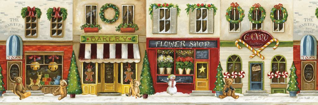 "Winter Teddy Bears I" by Lisa Audit is a charming and whimsical art piece that evokes the warmth and nostalgia of a festive winter village. This artwork seamlessly blends elements of folk art and contemporary illustrative style, capturing the essence of holiday cheer. The scene unfolds across a quaint village street adorned with classic storefronts, each meticulously detailed to enchant the viewer. The artwork features a row of welcoming shops, including a bakery, a flower shop, and a candy factory, each embellished with wreaths and festive garlands, creating a harmonious holiday ambiance. The subtle snow-covered rooftops and scattered evergreen trees add to the wintry aesthetic, immersing the viewer in a cozy, idyllic village setting. Playful teddy bears, depicted in a variety of delightful poses, engage in activities such as carrying presents and decorating, adding a touch of innocence and joy. Their presence enriches the narrative of the piece, appealing to both young and old. The careful composition and balanced color palette, primarily consisting of warm earthy tones and vibrant holiday reds and greens, evoke feelings of warmth and nostalgia. Lisa Audit's masterful use of light and shadow gives depth and personality to each element within the piece, making it a captivating and inviting artwork. "Winter Teddy Bears I" is classified under whimsical holiday art, embodying a timeless charm that makes it a perfect addition to any festive-themed collection.For more art by Lisa Audit click here.