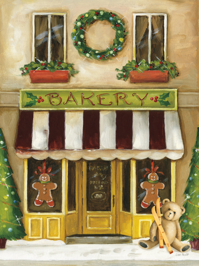 "Winter Teddy Bears III" by Lisa Audit is a captivating piece that harmoniously blends elements of nostalgia and whimsy. This artwork vividly captures a cozy winter scene, impeccably illustrating the inviting façade of a quaint bakery adorned with festive decorations. The use of a warm, subtle color palette along with intricate details invokes a sense of warmth and homeyness. In the foreground, a charming teddy bear is depicted holding a pair of playful skis, exuding a sense of innocent adventure. The bear is placed amidst snow-dusted evergreens, suggesting an idyllic winter wonderland. The expertly rendered window displays feature cheerful gingerbread figures, which, coupled with the festive garland wreath above, enhances the holiday spirit. Audit employs a sophisticated yet simplistic style with her brushwork, evoking a feeling of serene magic typical of winter. Her attention to detail and composition is noteworthy, creating a balanced and inviting scene that is both cheerful and timeless. This piece can be classified within the realm of contemporary folk art, as it reflects a modern interpretation of traditional holiday motifs. The delightful portrayal of everyday whimsy and charm makes "Winter Teddy Bears III" an appealing choice for those longing to capture the essence of festive warmth in their homes.For more art by Lisa Audit click here.