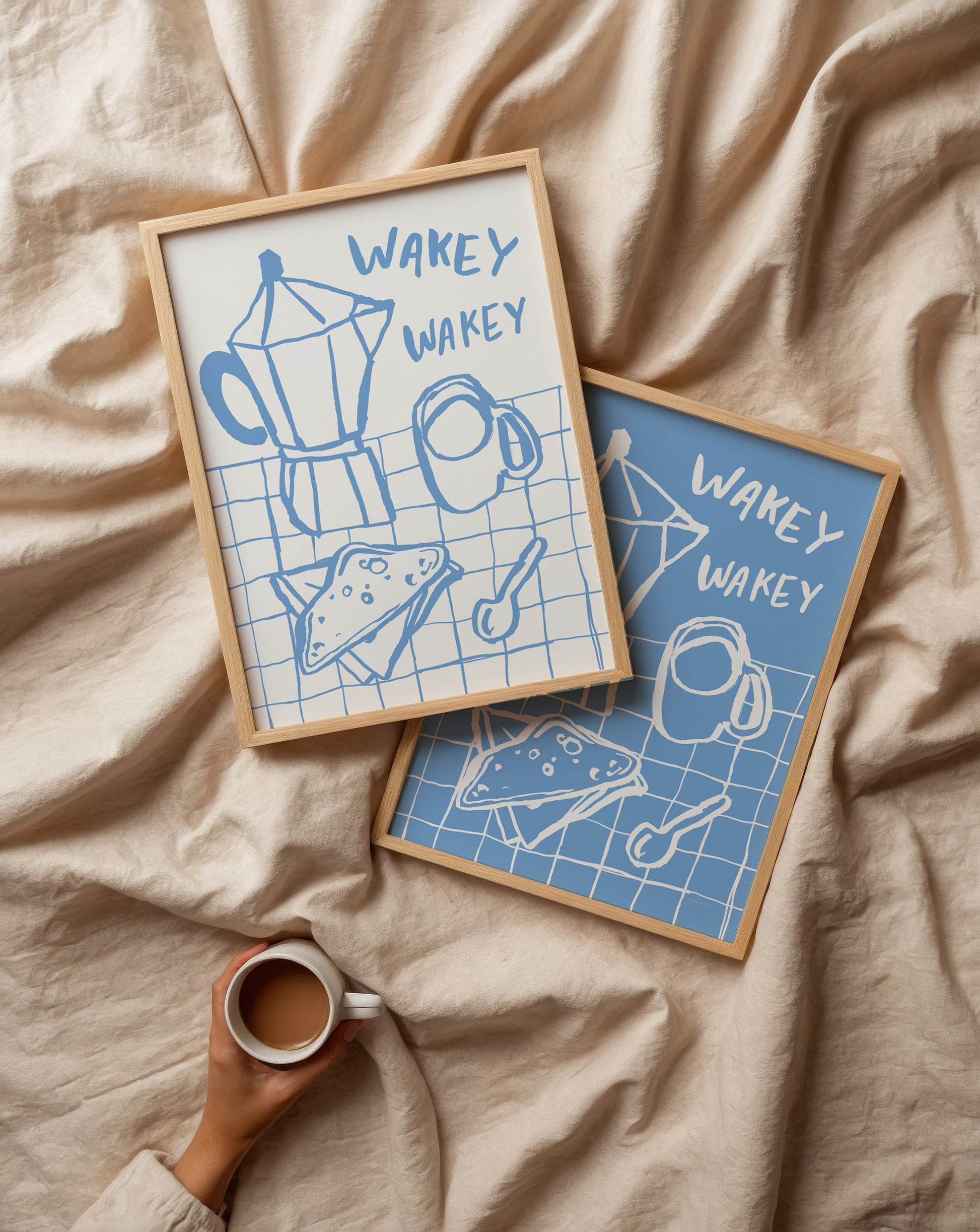 "Breakfast Doodles V White" by Jenaya Jackson is a captivating piece that stands at the intersection of contemporary minimalism and illustrative charm. This artwork, part of Jackson's renowned series, captures the serene essence of morning rituals through its simplistic yet evocative design. Rendered in soft, monochromatic hues, the piece features a moka pot, a steaming cup, and a slice of toast with an artistic squiggle that hints at a carefree breakfast. The light blue lines, reminiscent of hand-drawn doodles, convey a sense of spontaneity and immediacy, encouraging the viewer to embrace the informal beauty found in everyday objects. The phrase "Wakey Wakey," playfully handwritten, injects a cheerful note, inviting one to welcome the day with a gentle warmth. The background's grid pattern introduces an element of structure, balancing the free-spirited linework of the objects in the foreground. As a work of modern graphic design art, "Breakfast Doodles V White" embodies both simplicity and depth, making it an ideal piece for those who appreciate the intersection of casual elegance and artistic expression in domestic life.For more art by Jenaya Jackson click here.